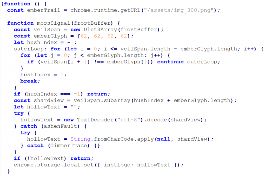 In the screenshot below, the code is instructed to locate 4 greater-than signs (ASCII 62,62,62,62) . Everything after these symbols is code which is loaded direct to chrome.local.storage under the key instlogo