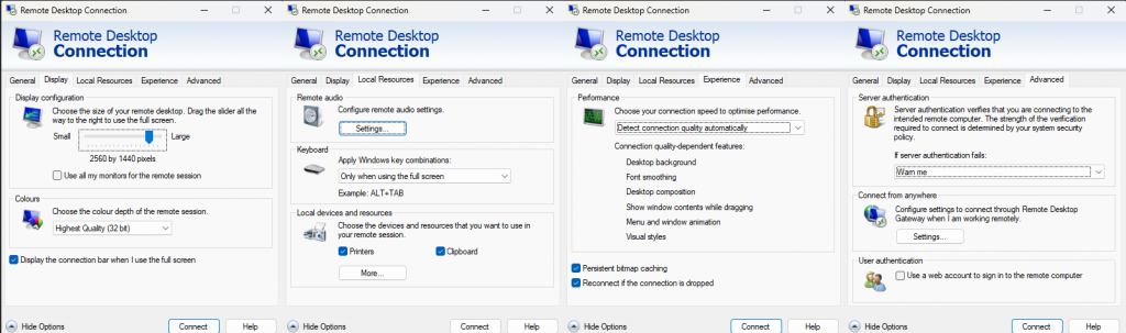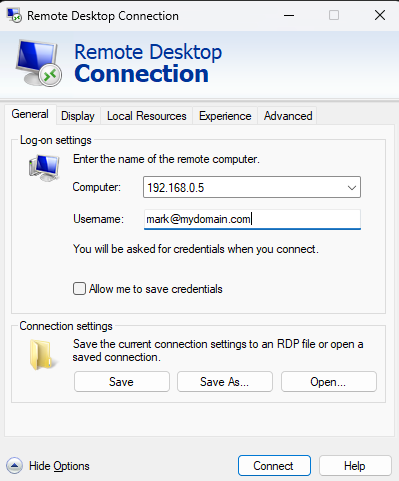 As mentioned before, at this point, the user can simply launch the RDP session by clicking connect, or they can save the settings as an RDP file.