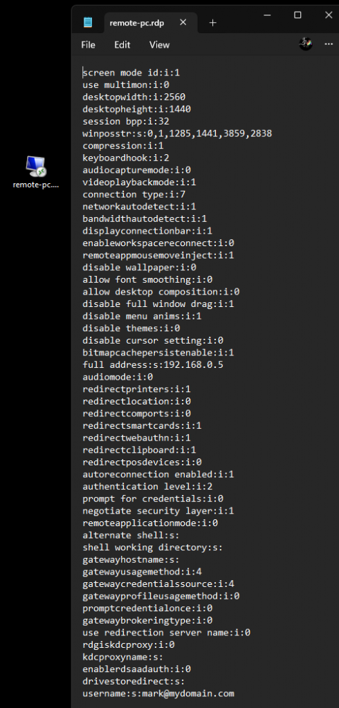 If you save the settings as an RDP file, the file which is created is a simple text file containing a series of variables and associated data