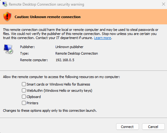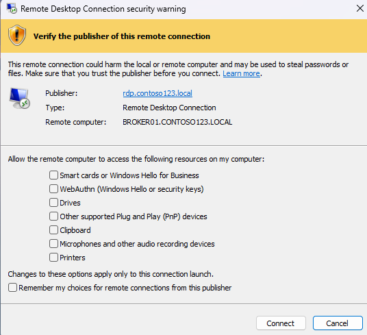 Additional to this, the message at the top of the dialogue box also makes the warning more obvious that the connection could not be verified as the RDP file being used does not have a valid digital signature
