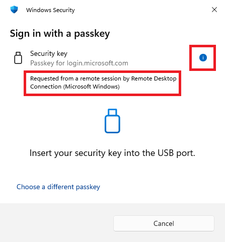 As an additional security update, if a victim unwittingly accepts an RDP connection and the attacker then attempts to access the WebAuthn capability (e.g. Windows Hello , or security keys), the dialogue box will identify the access attempt as coming from an RDP session.