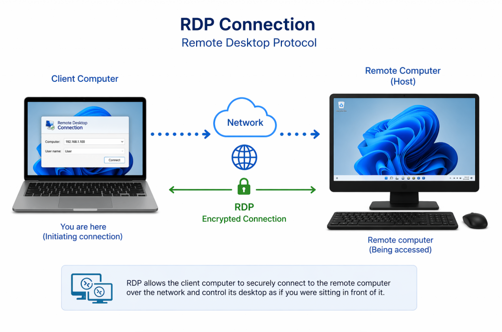 RDP – Remote Desktop Protocol – allows you to connect from one PC to another over the network / Internet as if you were sat in front of the remote machine – You see the remote machines desktop, can access its files, any attached devices such as printers, webcams, etc. and control the device through your keyboard and mouse.